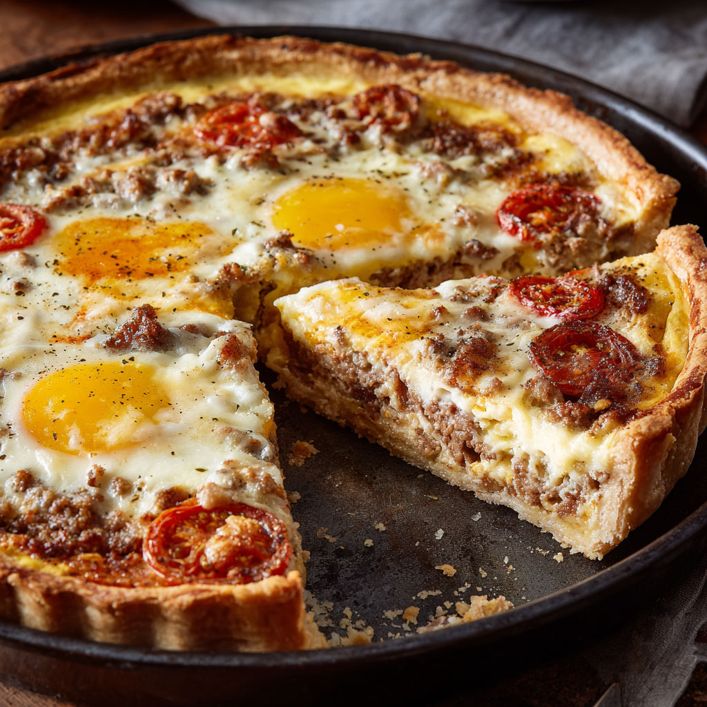 Tarte à la viande hachée aux œufs, tomates et fromage